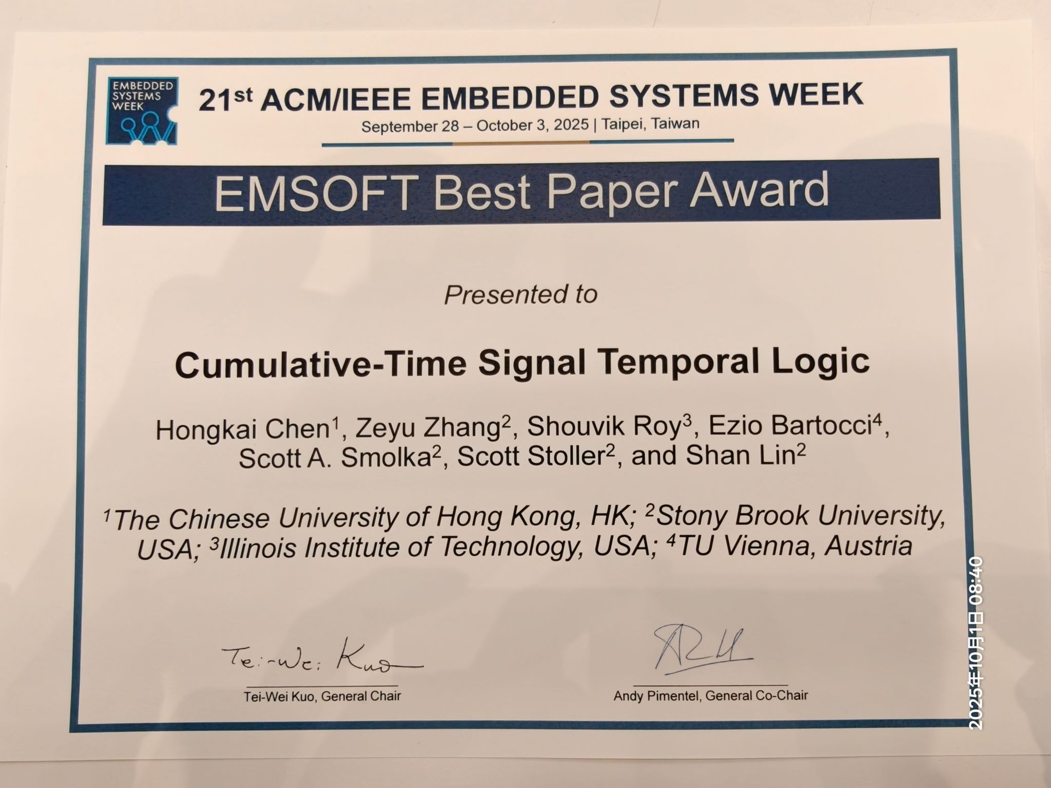 Ezio Bartocci, together with Hongkai Chen (The Chinese University of Hong Kong, China), Zeyu Zhang (Stony Brook University, USA), Shouvik Roy (Illinois Institute of Technology, USA), and Scott Smolka, Scott Stoller, and Shan Lin (all Stony Brook University, USA), have been awarded the EMSOFT Best Paper Award at Embedded Systems Week 2025 for their work on “Cumulative-Time Signal Temporal Logic.“